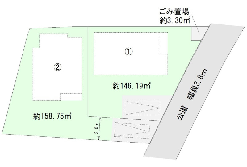 | 備考 | ※景観法 ※航空法 ※宅地造成及び特定盛土等規制法 ※分筆前につき、地積の増減が生じる場合がございます。 ※ゴミ置場持ち分約3.2m2×各1/2